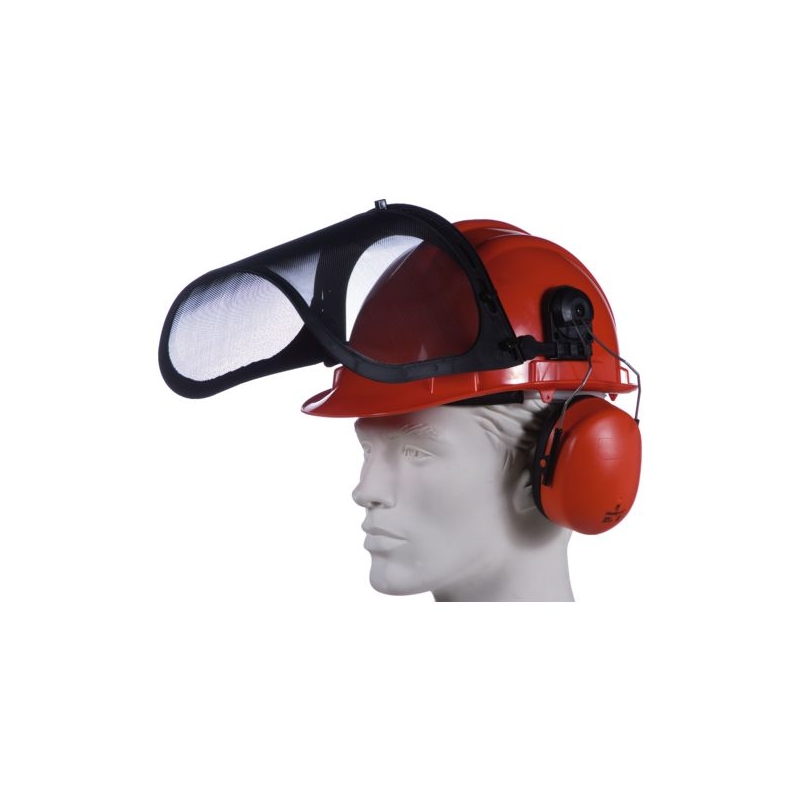 Protection de la tête forestier composée de : - casque Calotte en ABS, 4 points de fixation, coiffe textile, tour de tête en plastique équipé d'un serre-nuque à crémaillère permettant un réglage facile, mousse de confort à l'arrière, bandeau antitranspiration. Coloris : orange Norme : CE Cat II - EN 397 - coquilles antibruit adaptables par encliquetage SNR 25,9 dB. Coloris : orange Norme : CE Cat III - EN 352-3 - porte-visière et visière grillagée. Norme : CE Cat II - EN 1731 Poids : 779 g