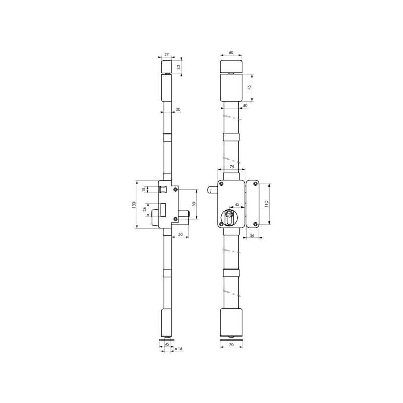 Acier embouti 20/10e. Pour porte de 1650 à 2250 mm. Rappel équerre du ½ tour. Pênes haut et bas en acier Ø 16 mm, tringles ajustables. Béquille double fournie pour modèle à fouillot. Livré avec gâche, sans cylindre (pour porte de 45 mm, prévoir cylindre 30 x 65 mm). Existe aussi en blanc, nous consulter. Coffre : 75 x 130 mm Axe : 45 mm Entraxe : 70 mm Fouillot carré : 7 mm Finition : marron Conditionnement : boite