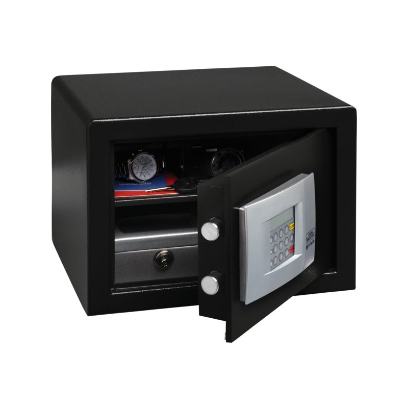 Corps solide à une paroi avec étagère amovible. Porte à double paroi. Conçu pour être fixé au mur ou au sol, livré avec matériel de fixation. Utilisation confortable grâce au verrouillage/déverrouillage automatique par pênes motorisés. Avec code administrateur et code utilisateur. Alimentation par 4 piles LR 06 incluses. Serrure additionnelle avec clé de secours. Dimensions extérieures (HxLxP) : 320 x 442 x 350 mm Dimensions intérieures (HxLxP) : 310 x 435 x 288 mm Ouverture de la porte (HxL) : 188 x 230 mm Poids : 20 kg Volume : 38.8 l
