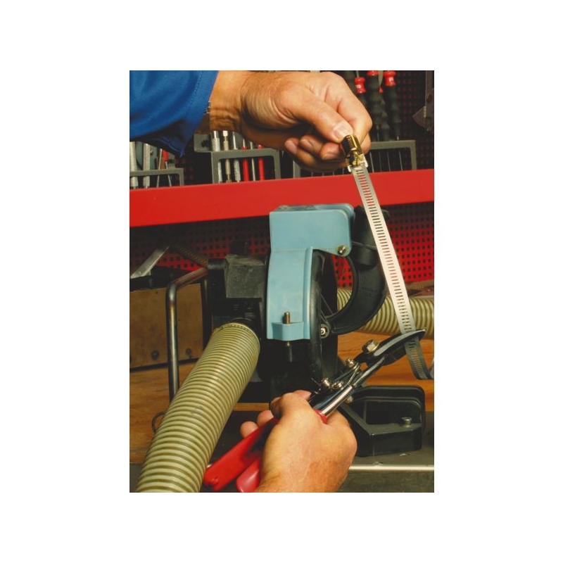 Le collier à façon, du plus petit au plus grand. Boîtier et bande en acier chromé inoxydable, vis en acier zingué bichromaté. Composé de : - 1 dévidoir de 25 m de bande sans fin ajourée, - 50 têtes.