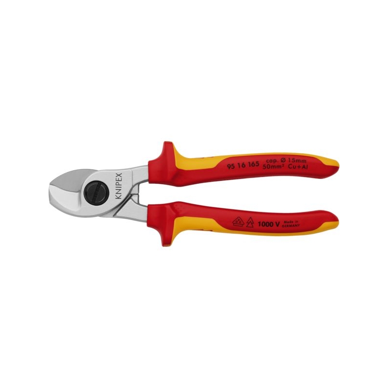 Coupe sans écrasement par étape en séparant les fils pour économiser de l'énergie. Tranchants trempés par induction. Protection anti-pincement. Poignées gainées bi-matière isolées 1000 V. Capacité de coupe : Ø 15 mm Longueur : 160 mm Norme : EN 60900