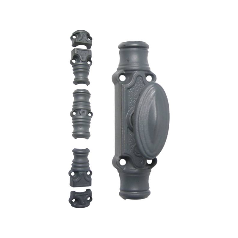 En fonte. Pour tringle ½ ronde 18 x 9 mm. Composition du kit : - 1 boitier RY70 bouton confort, - 1 coulant, - 2 chapiteaux, - 2 gâches. Dimensions boitier : 158 x 43 x 19 mm Finition : apprêt gris Conditionnement : boite