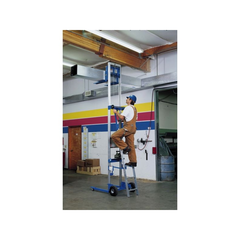 Élévation par le biais d'un treuil manuel. En aluminium léger. Installation rapide sans outils. Roulettes avant/arrière très manœuvrables, passe les portes. Grande facilité de chargement/déchargement de véhicules utilitaires. Pour faciliter la manutention de charges diverses. Norme : CE EN 280 Échelle d'accès vendue séparément.