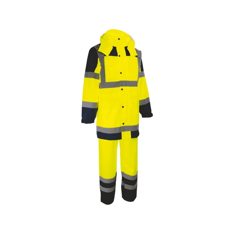 100% polyester Oxford 300D enduit PU. Veste : Bandes rétroréfléchissantes 2 horizontales, 2 brassards et bretelles, coutures étanchées, doublure filet, 2 poches basses, 1 poche poitrine téléphone. Capuche fixe enroulée dans le col avec vision latérale, fermeture centrale à glissière sous rabat pressions, poignets réglables. Pantalon : 2 bandes rétroréfléchissantes, serrage élastique à la taille, braguette. Coloris : jaune fluo/bleu marine, orange fluo/bleu marine Taille : M à XXL Norme : CE Cat II - EN ISO 20471 (3) pour la veste - EN ISO 20471 (1) pour le pantalon - EN 343 (3.1)