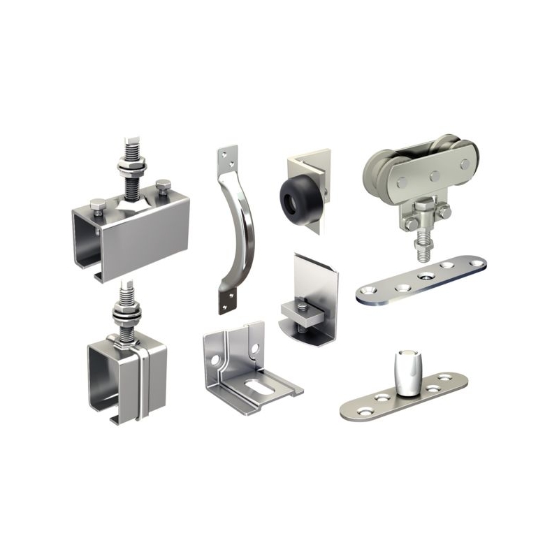 Pour porte de 80 kg. Montage avec profil U, guide bas 1 olive. Composée de : - 2 montures 0235D avec 2 galets en nylon montés sur cage à rouleaux, - 2 platines 0036, - 5 (code 53699) ou 7 (code 53707) supports enveloppants 3531, - 1 support manchon 3531 MC (uniquement pour le code 53707), - 5 (code 53699) ou 8 (code 53707) pattes équerre 3533, - 2 enjoliveurs 3540, - 2 guides du bas à olive à visser 1102, - 2 butées 1086, - 1 poignée 1298. Conditionnement : boîte