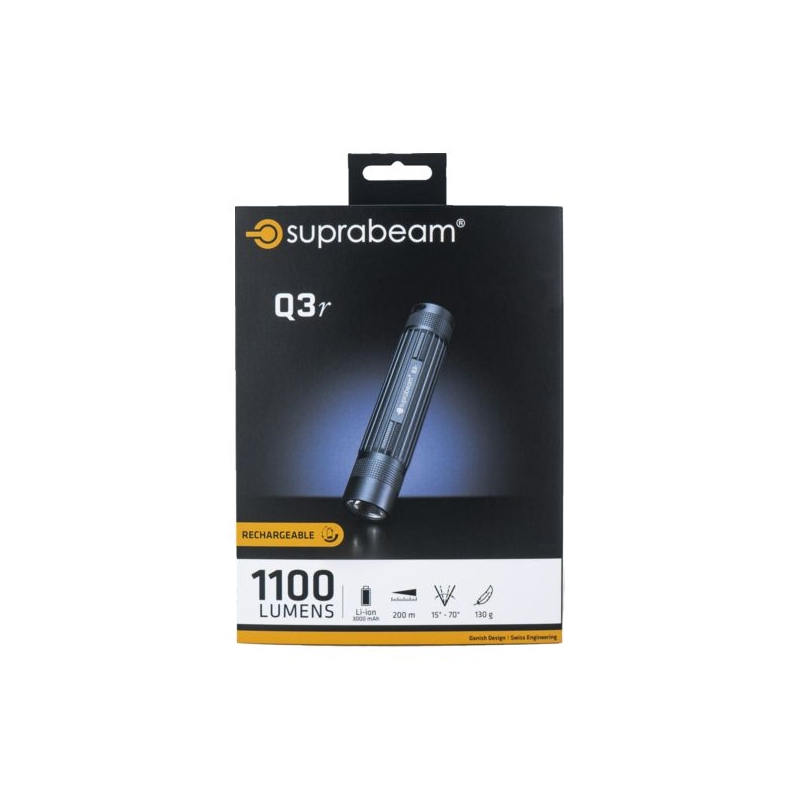Boîtier en aluminium. Orientable, permet de basculer de 15 à 70°. Flux lumineux : 1100 lm Portée d'éclairage : 200 m Autonomie : jusqu'à 300 h Indice de protection : IP 68 Livrée avec batterie Li-Ion rechargeable, câble USB, lanière et étui.