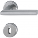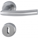 Ensemble monobloc en acier inoxydable AISI 202, béquille à ressort solidarisées. Pour porte intérieure d’épaisseur de 35 à 45 mm. Fixation i...